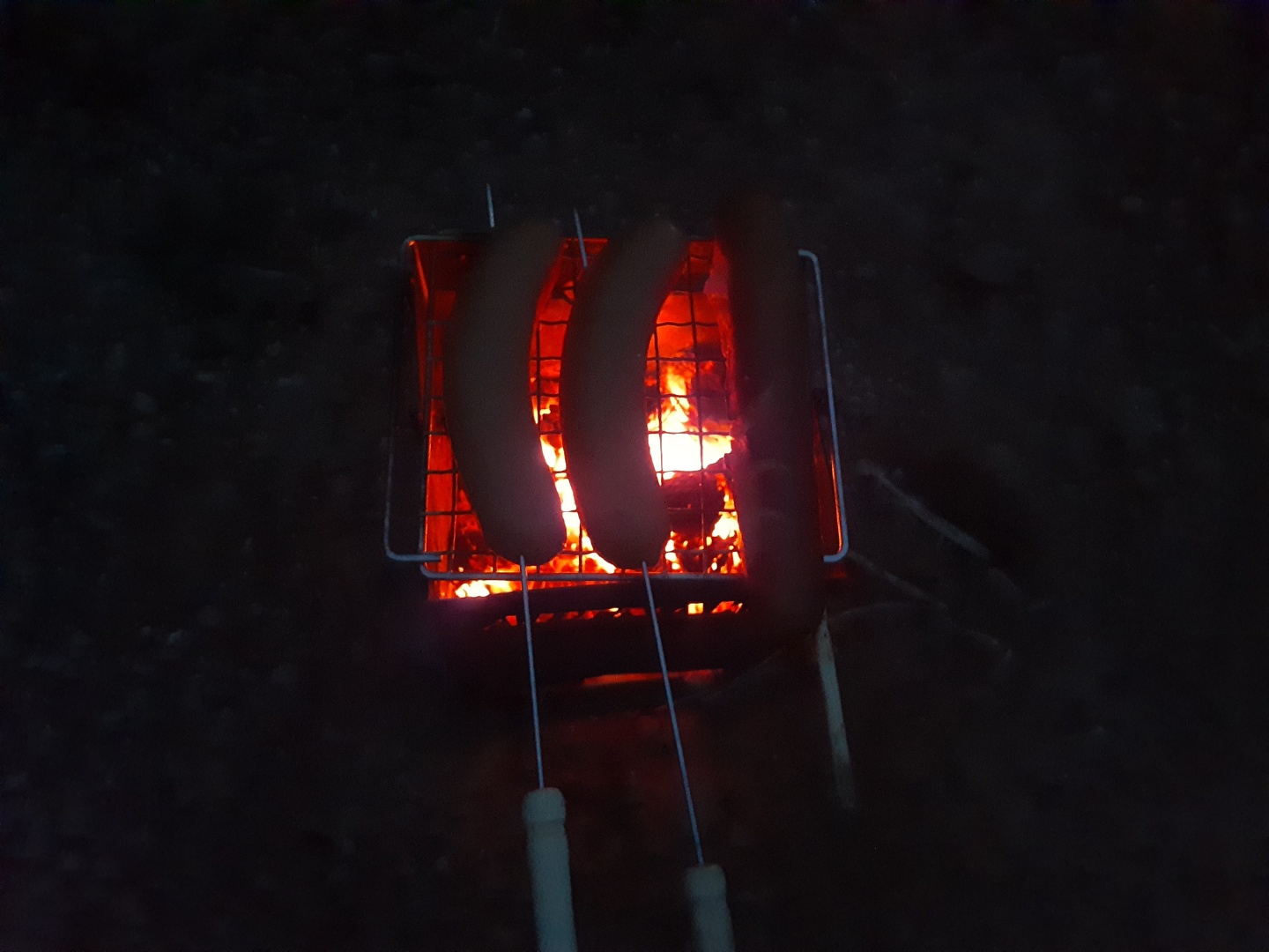 바닷가에 왔으니, 회에 소주 한잔 안 할 수가 없지요. 술에 취해 분위기에 취에 맛있게 먹습니다. 주변에 있는 솔방울을 모아서 불멍아닌 불멍도 해보고, 타고 남은 숯에는 캠핑의 묘미 소시지를 구워 먹습니다.
