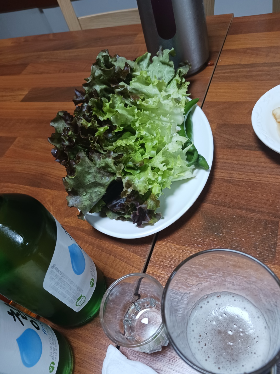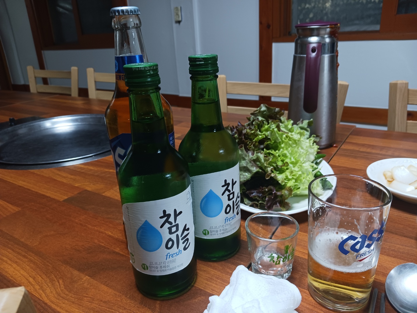 역시 좋은 안주에는 술이 빠질수가 없습니다. 고기와 소주는 궁합이 정말 잘 맞는 거 같습니다. 고기를 먹은 후 기름진 입안에 소주 한잔 털어 넣으면, 입가심이 싹 되면서 다시 고기를 먹게 해 주는 거 같습니다. 술이 취해서 뇌가 고장 난 걸 수도 있는 거 같기도 합니다. 술은 마신 날은 너무 과식을 하게 됩니다.
