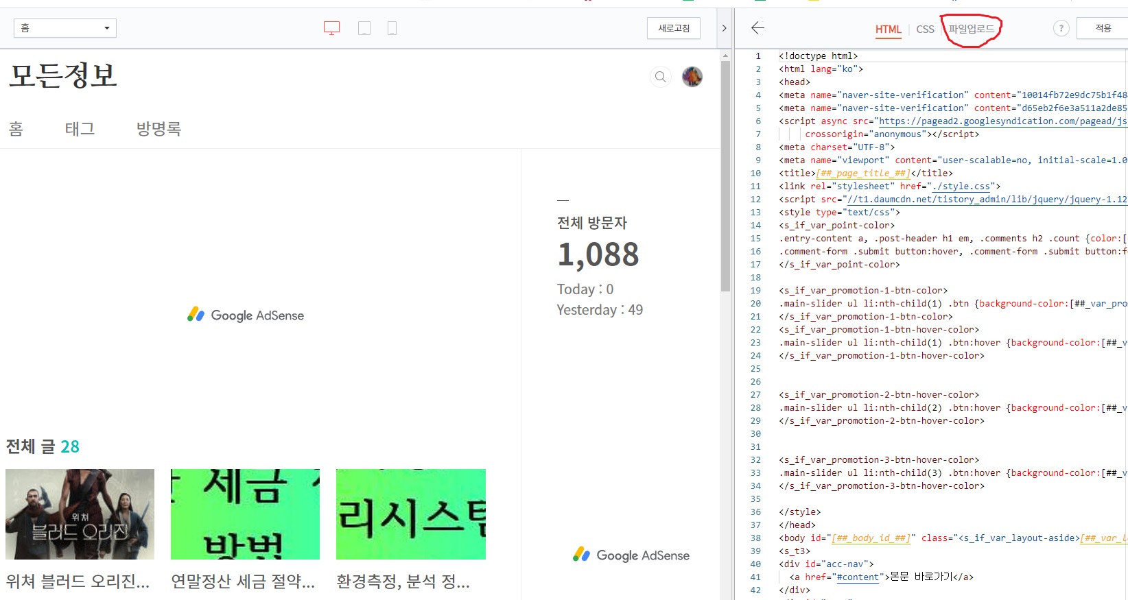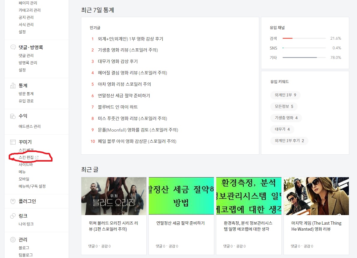 그다음 내 티스토리 관리 화면으로 와서 스킨편집을 누른다.