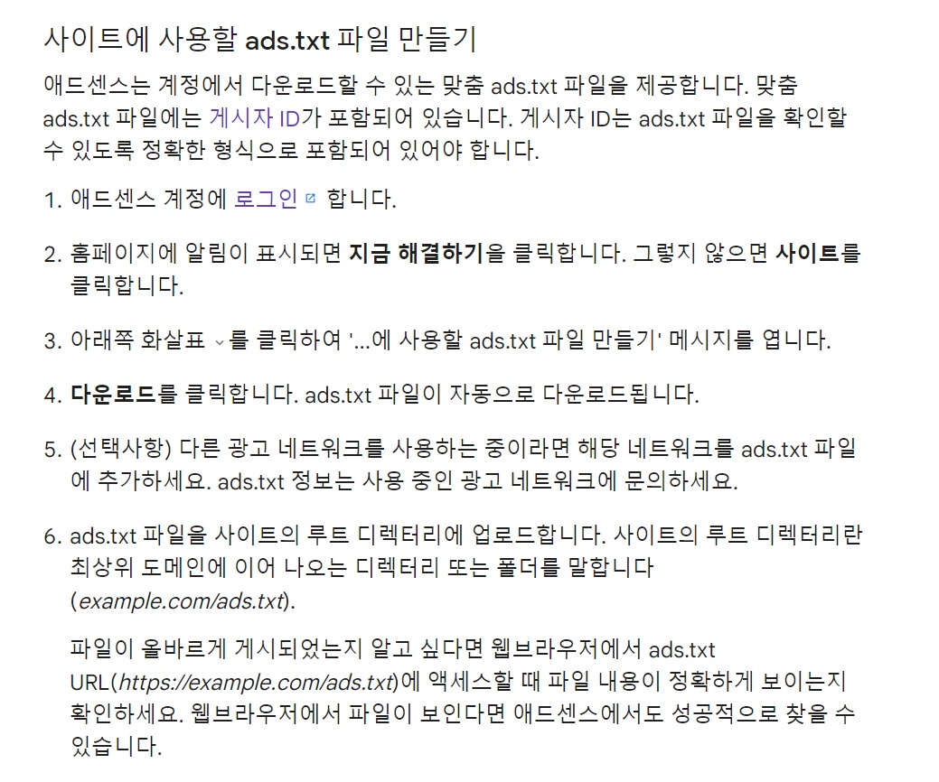 들어가서 자세히 읽어보면 ads.txt를 만드는 버튼이 보인다. 그걸 클릭후 내 컴퓨터에 파일을 만든다.