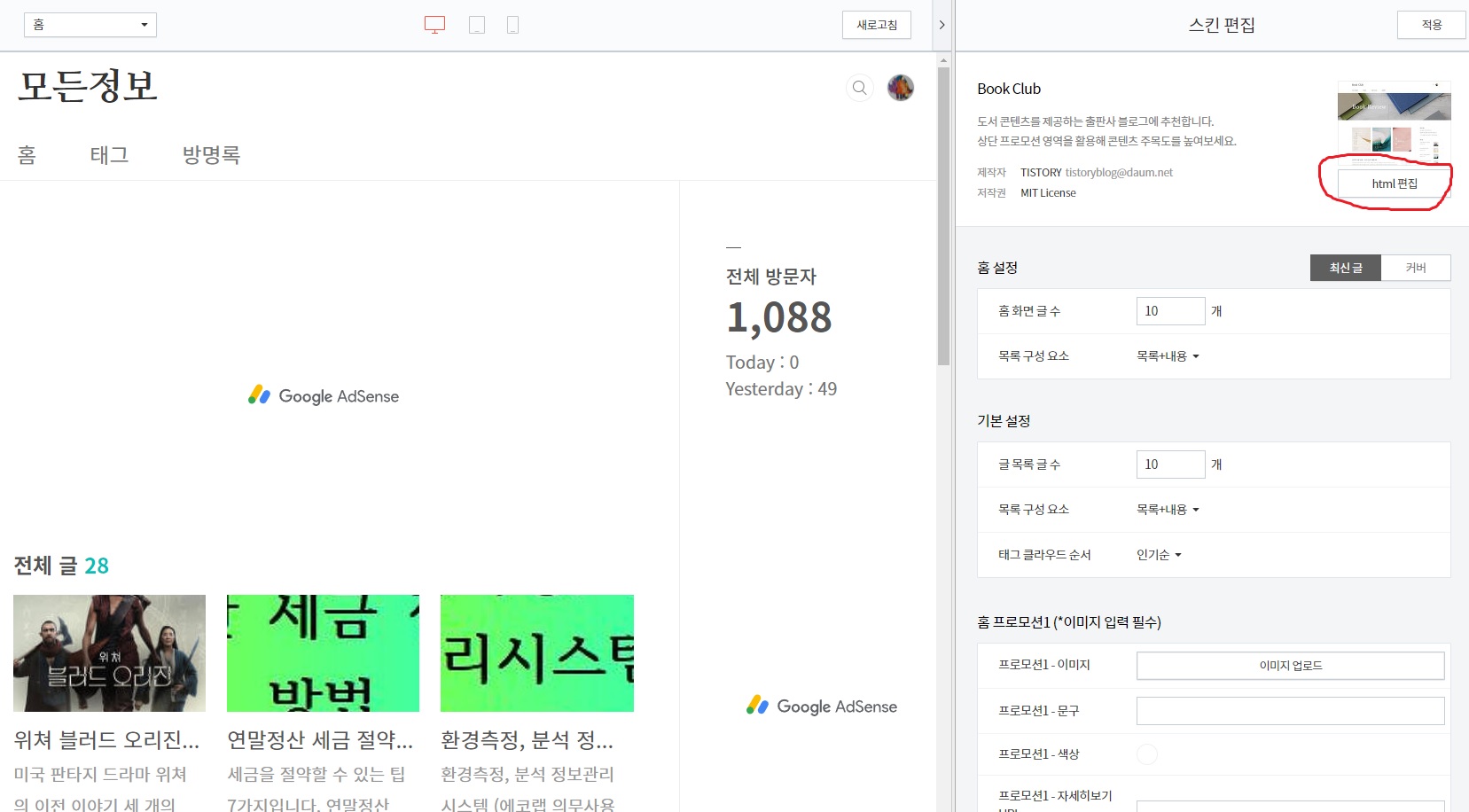 그다음 내 티스토리 관리 화면으로 와서 스킨편집을 누른다.
