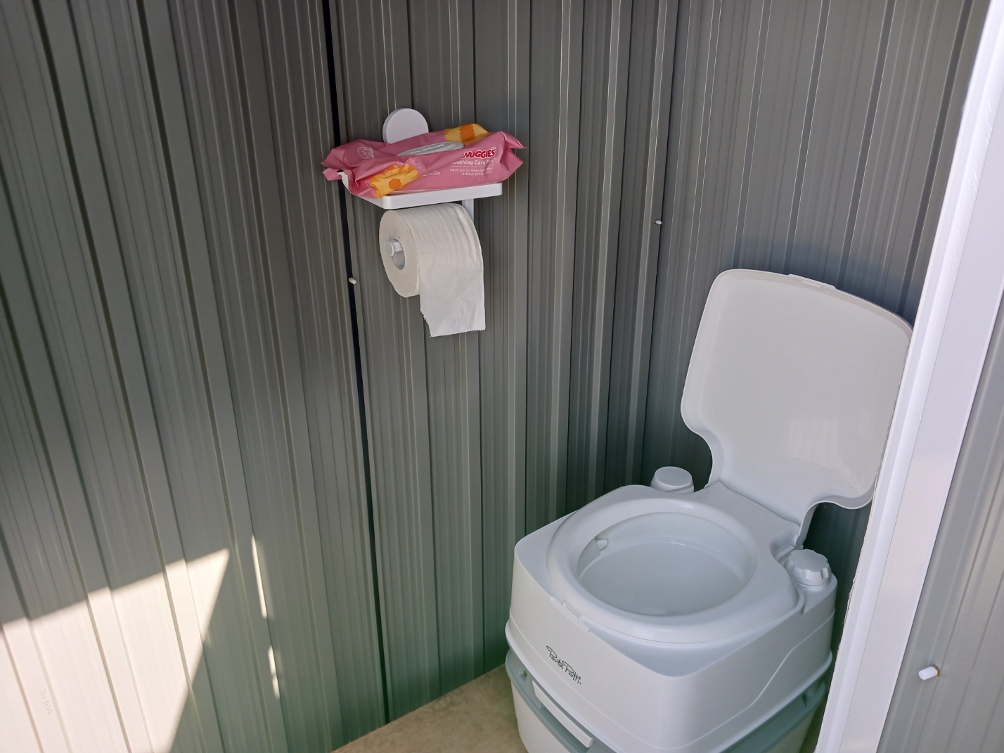 반나절에 걸쳐 만들어진 위드퍼니처 야외 보관창고 중형에 다이소 화장지 걸이와 휴지통이 위치한다. 하지만 창고가 검은색이라서 여름 낮에는 볼이 보기가 쉽지는 않을 듯하다. 하지만 생리현상이 급해지면 그런 건 아무렇지 않게 된다. 땀을 한 바가지 흘리더라도 생리현상을 해결하는 것밖에는 뇌에서 없어지지 않기 때문이다.