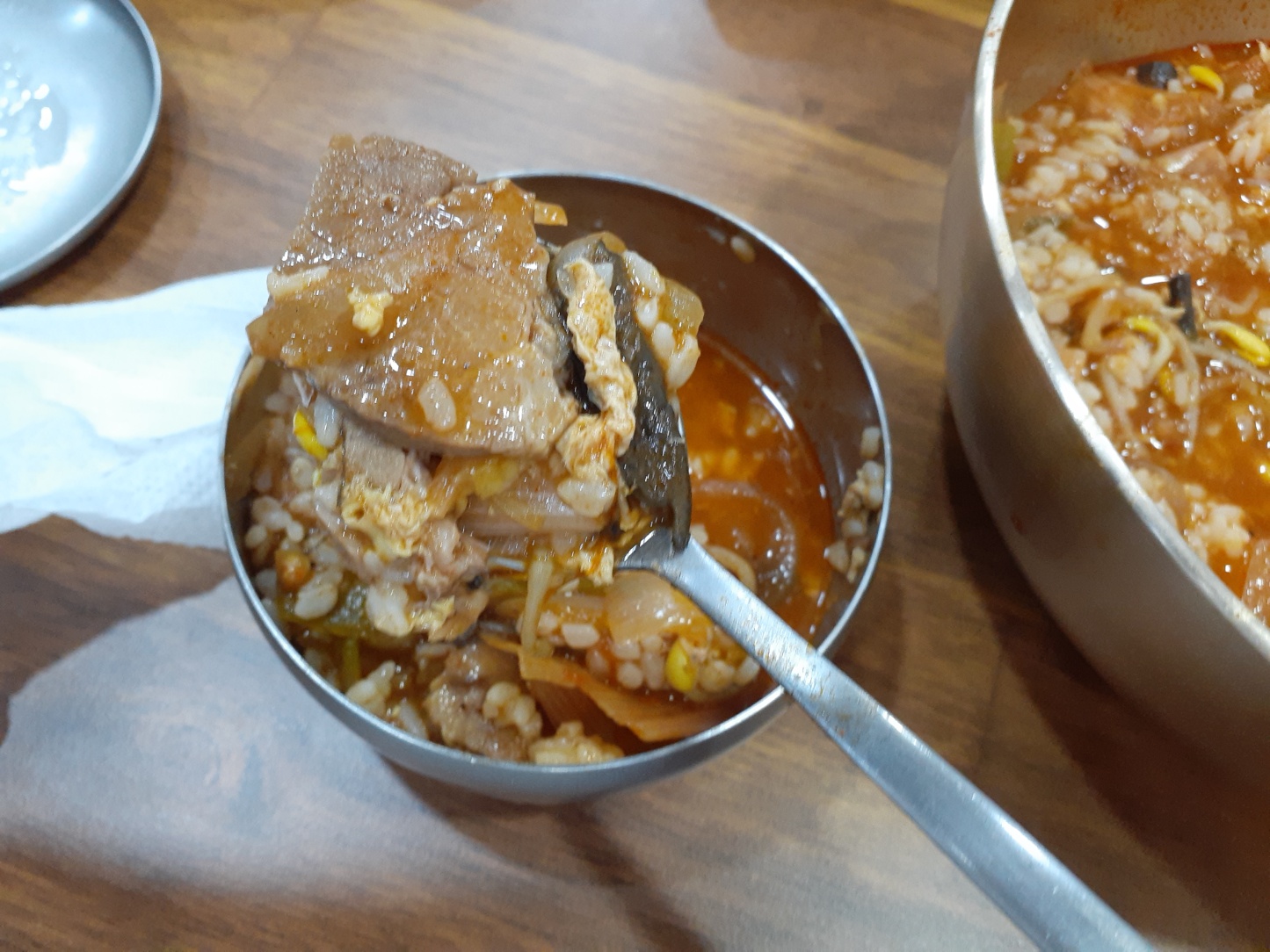육개장에 들어있는 소고기도 얇게 쭉쭉 찢어진 소고기가 아니고, 안동장터 국밥식으로 두툼한 소고기가 들어있습니다. 소고기가 두툼한 만큼 육개장 또한 씹는 맛이 좋습니다. 육개장이 오늘은 살짝 짠 느낌이 있었지만 필자는 원래 짜게 먹기 때문에 맛있었습니다. 탕수육과 같이 먹는 바람에 육개장 바닥을 보진 못했습니다.